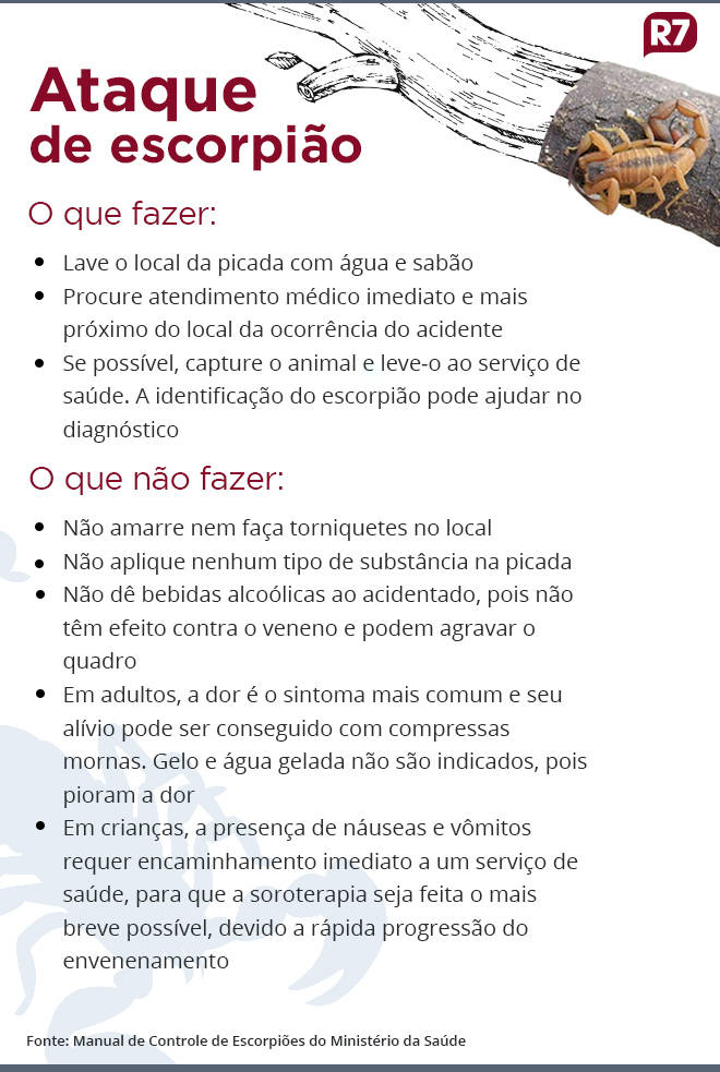 Em caso de acidente com escorpião, o Ministério orienta a ir imediatamente ao hospital mais próximo. O soro antiescorpiônico, necessário em casos moderados e graves, é disponibilizado apenas em hospitais de referência do SUS (Sistema Único de Saúde) e não pode ser encontrado em clínicas particulares, segundo a pasta.